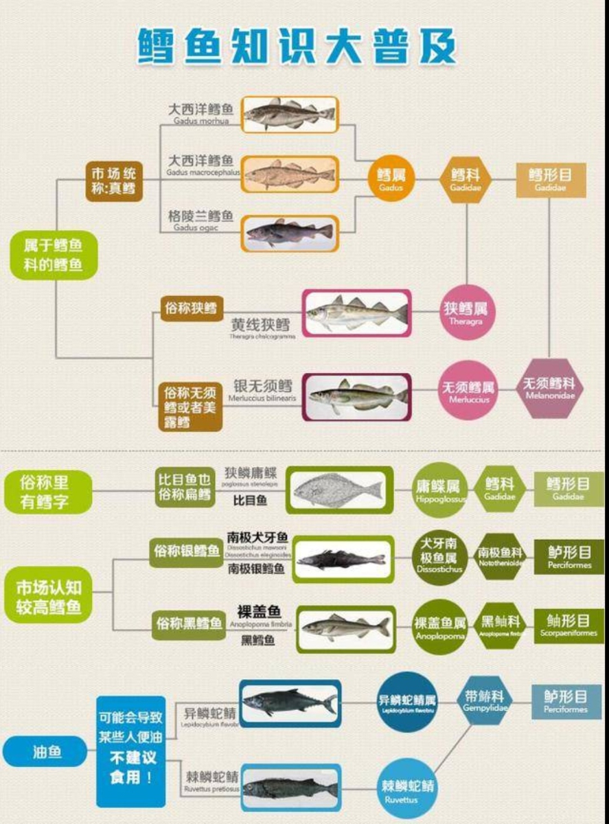 【科普】鳕鱼科普如图,特别指出:油鱼(异鳞蛇鲭/棘鳞蛇鲭)与鳕鱼相似,但不是鳕鱼,切片后不易辨认,如果商家把油鱼当鳕鱼卖,很多人会误吃。油鱼含有人体不能消化的蜡酯,吃后连续数天肛门“漏油”,大便排油,风险难料,不建议食用。